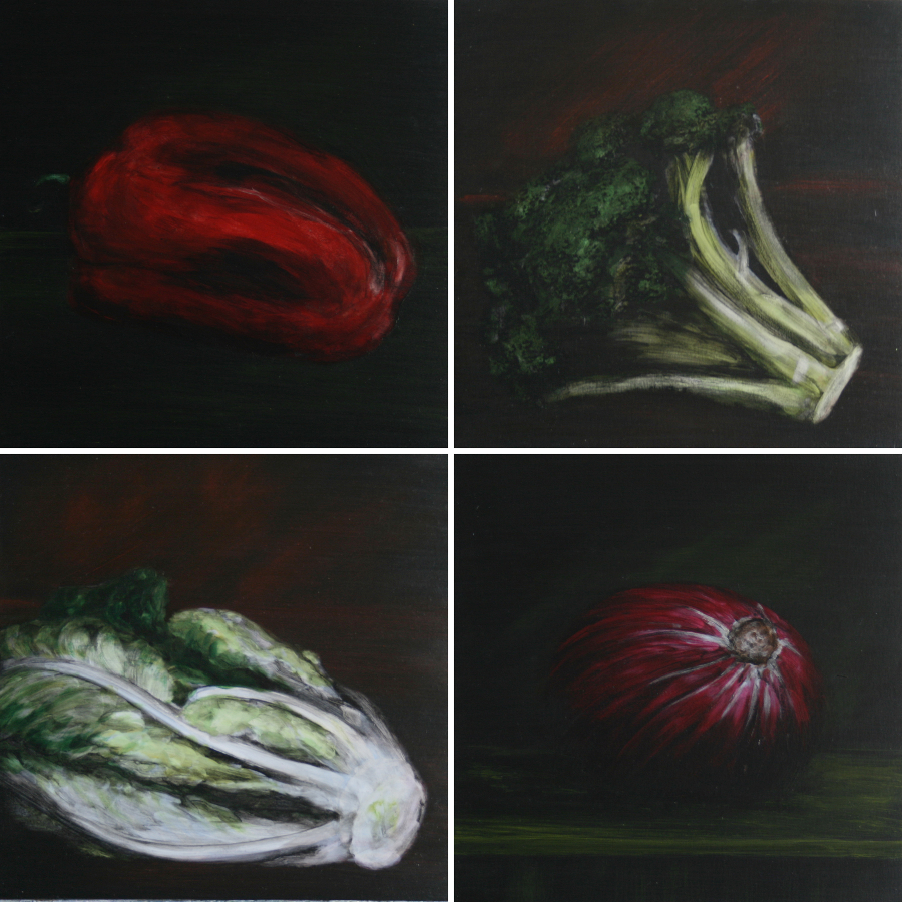 PIMIENTO, BRÓCOLI, LECHUGA, CEBOLLA (oscuridad primordial) acrílico – tabla 60 x 60 cm.
